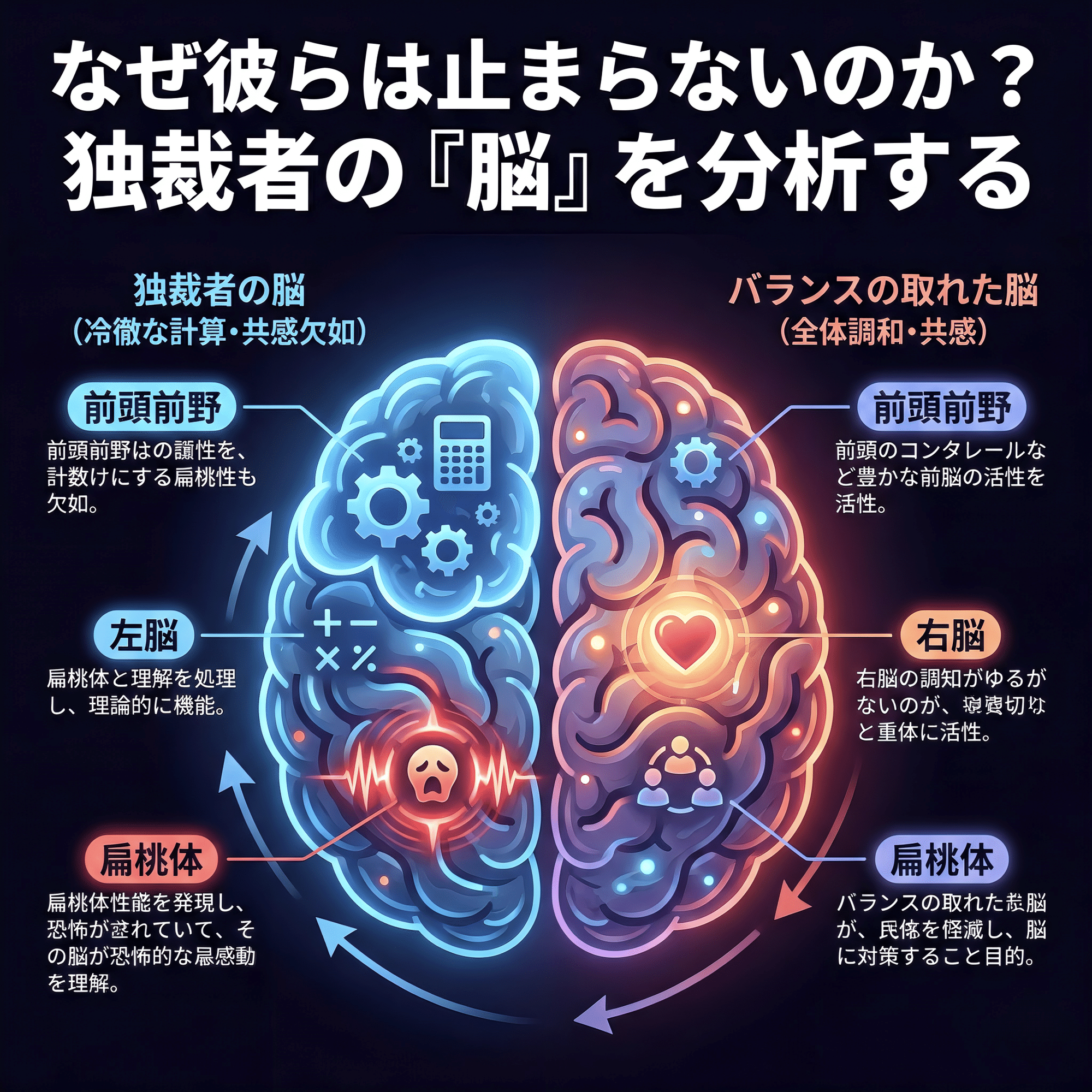 - 共感性の欠如: 本来、前頭前野には他者への共感や道徳を司る機能がありますが、そこが麻痺しているかのように、他者の痛みを想像せず、目的のためなら犠牲を厭いません。