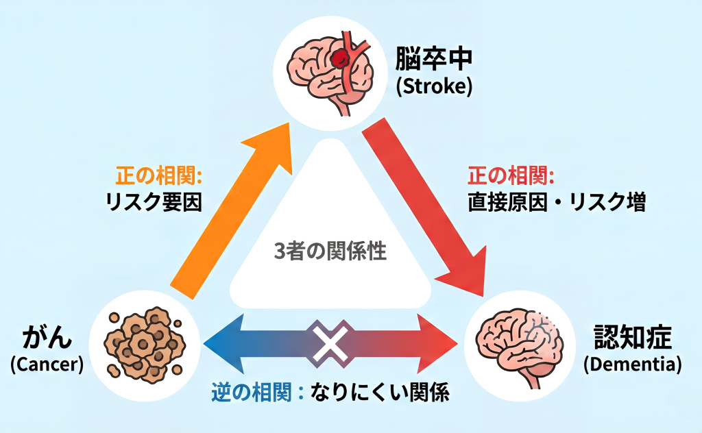1. 脳卒中 → 認知症(正の相関): これは因果関係が明確です。脳血管のダメージは、血管性認知症の直接的な原因となります。