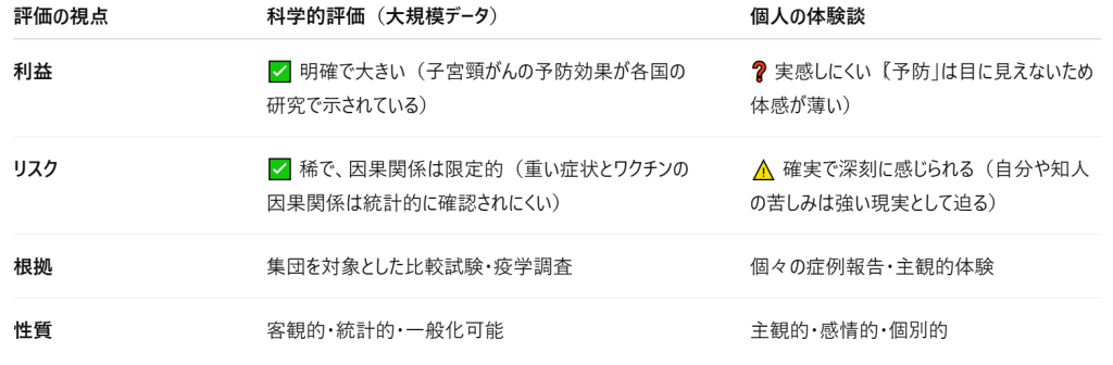 この“感情とデータの乖離”を最も象徴する例の一つが、子宮頸がん(HPV)ワクチンです。この問題を整理するために、2つの異なる視点を比較してみましょう。
