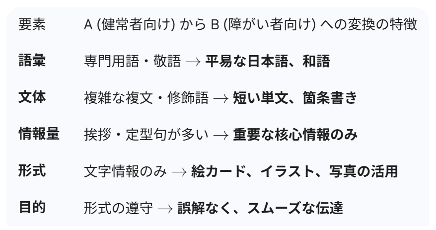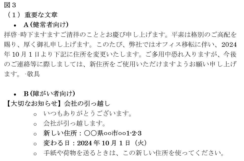 図3に示すように、A(一般的な文章)は理解できても、B(障がい者にとって困難な文章)では理解が難しいことがあります。そこで、生成AIが文章を修正し、短い文にしたり、内容を分解したりすることで、理解できることが多くなると考えられます。