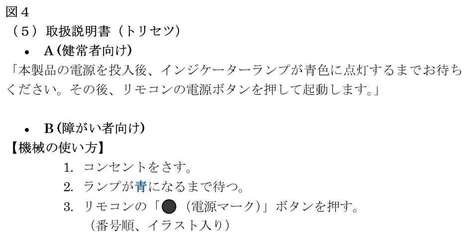 図4に示すように、取扱説明書のようなA(一般的な文章)であっても、すぐには理解できないことがあります。生成AIで文章を修正し、短い文に分解し、さらに画像やイラストを追加することで、理解しやすくなる場面が多いと考えています。
