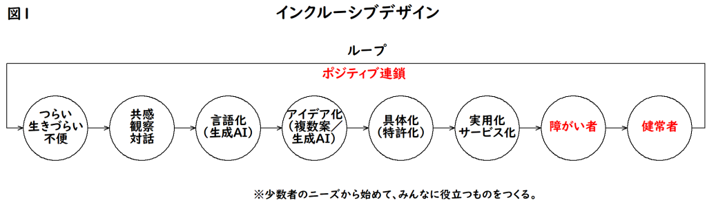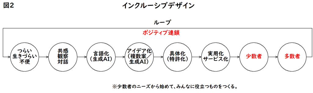 また、ポジティブ連鎖とは、インクルーシブデザインのプロセスにおいて、少数者の「つらい・生きづらい・不便」という極端なニーズの解決から生まれた製品やサービスが、結果として誰もが使いやすいものとして広く普及し、社会に良い影響をもたらす好循環のことです(図1)。